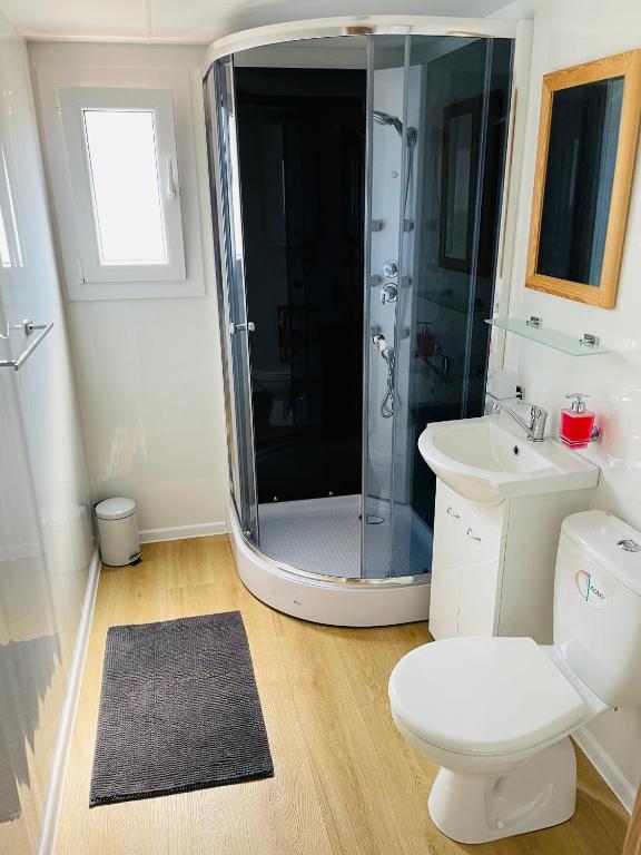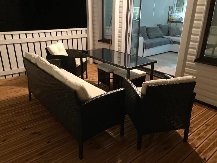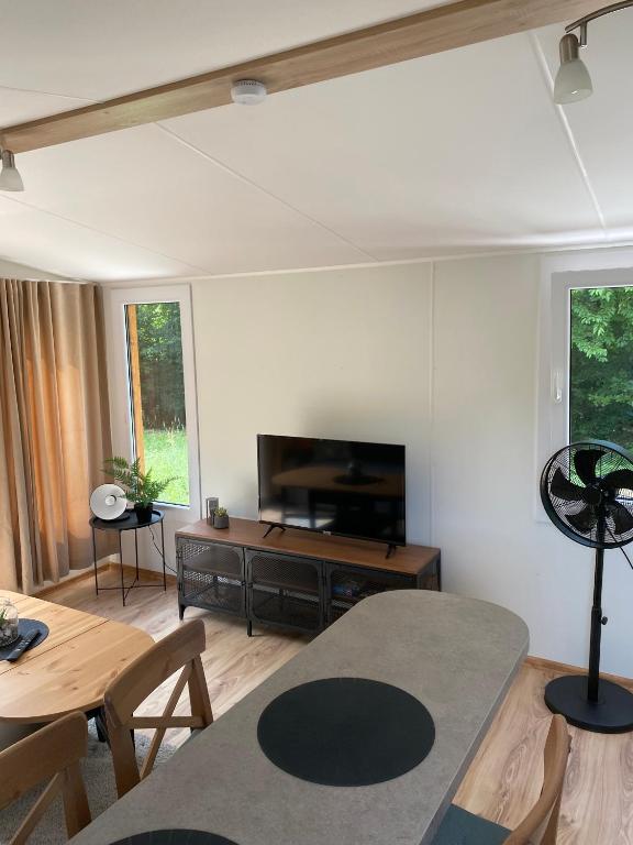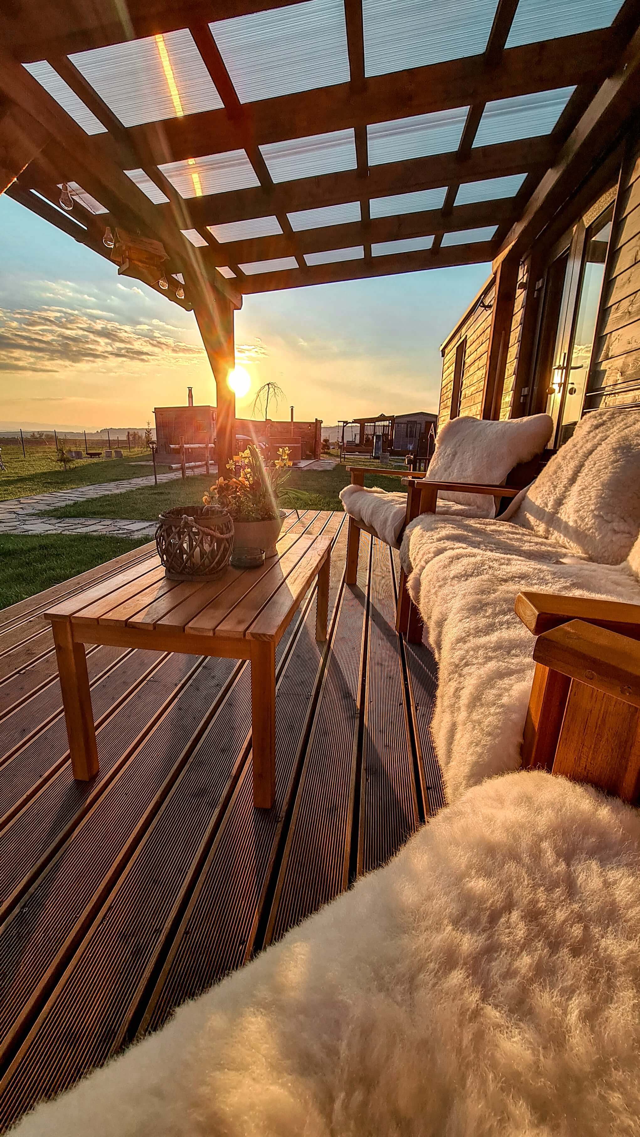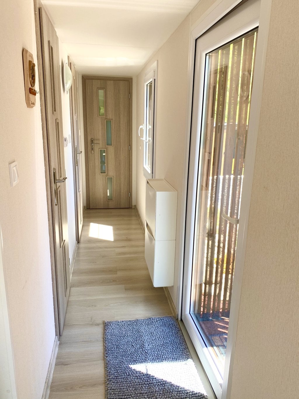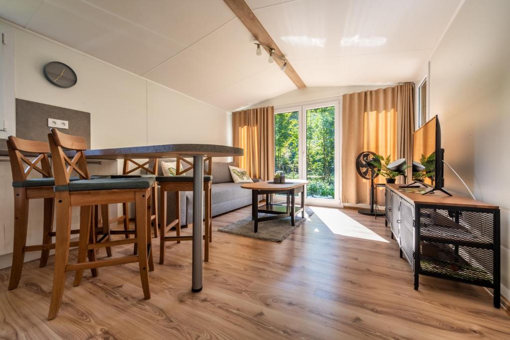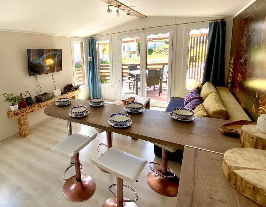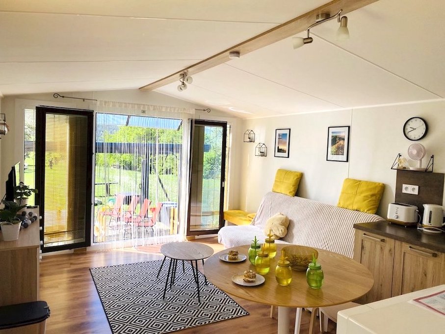 Světlý obývací pokoj s terasou v mobilním domě Super Arktik