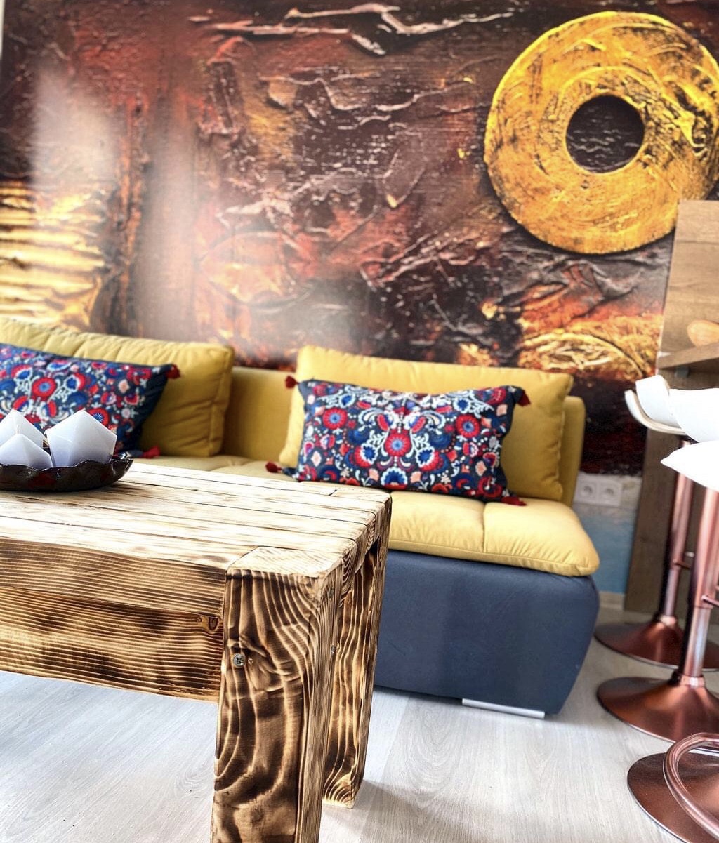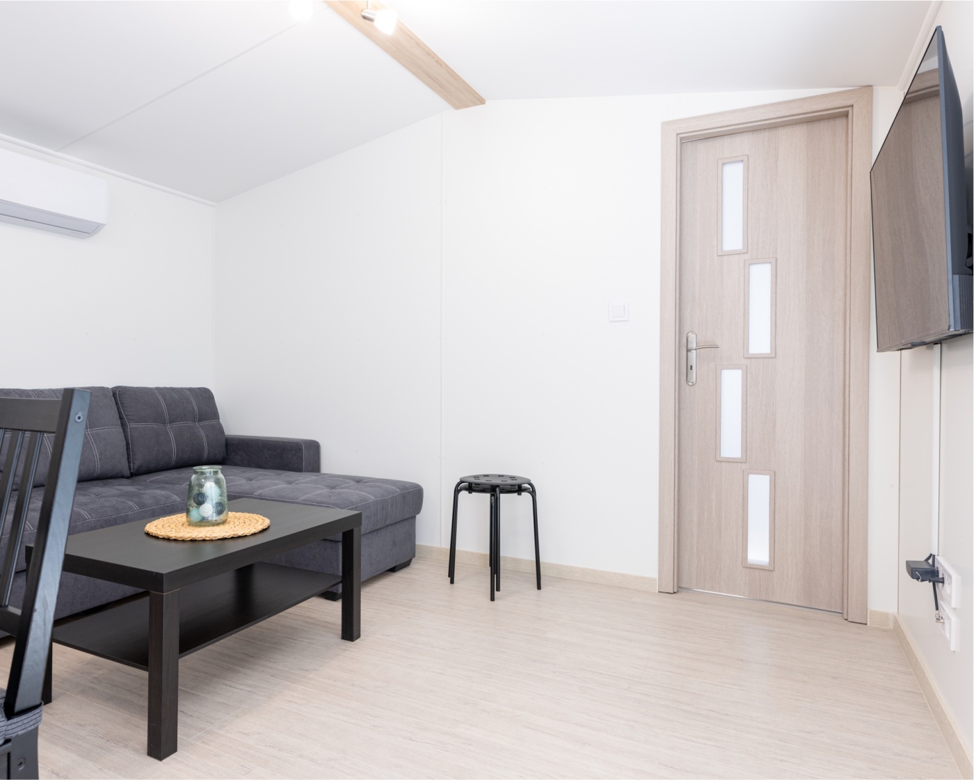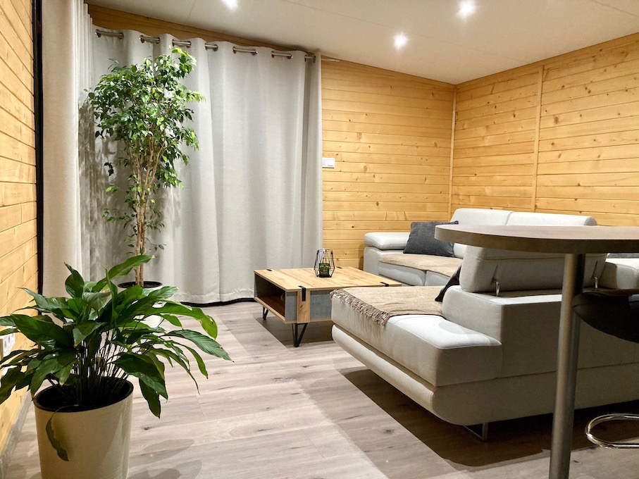 Obývací pokoj v mobilním domě Super Arktik s dřevěným interiérem