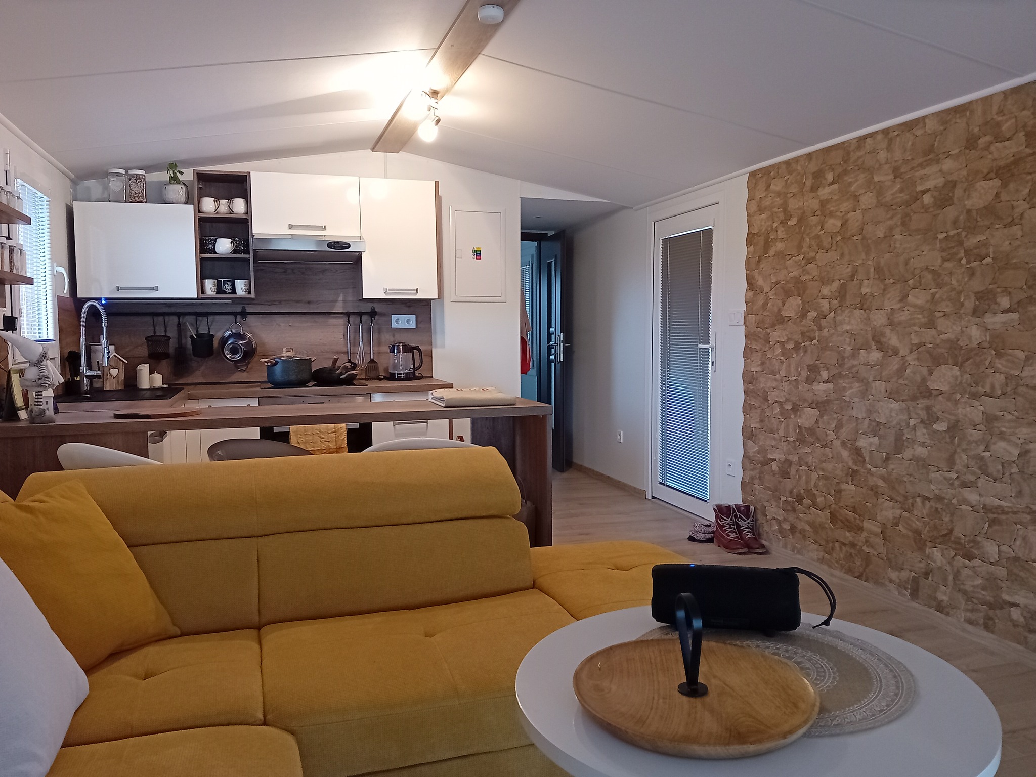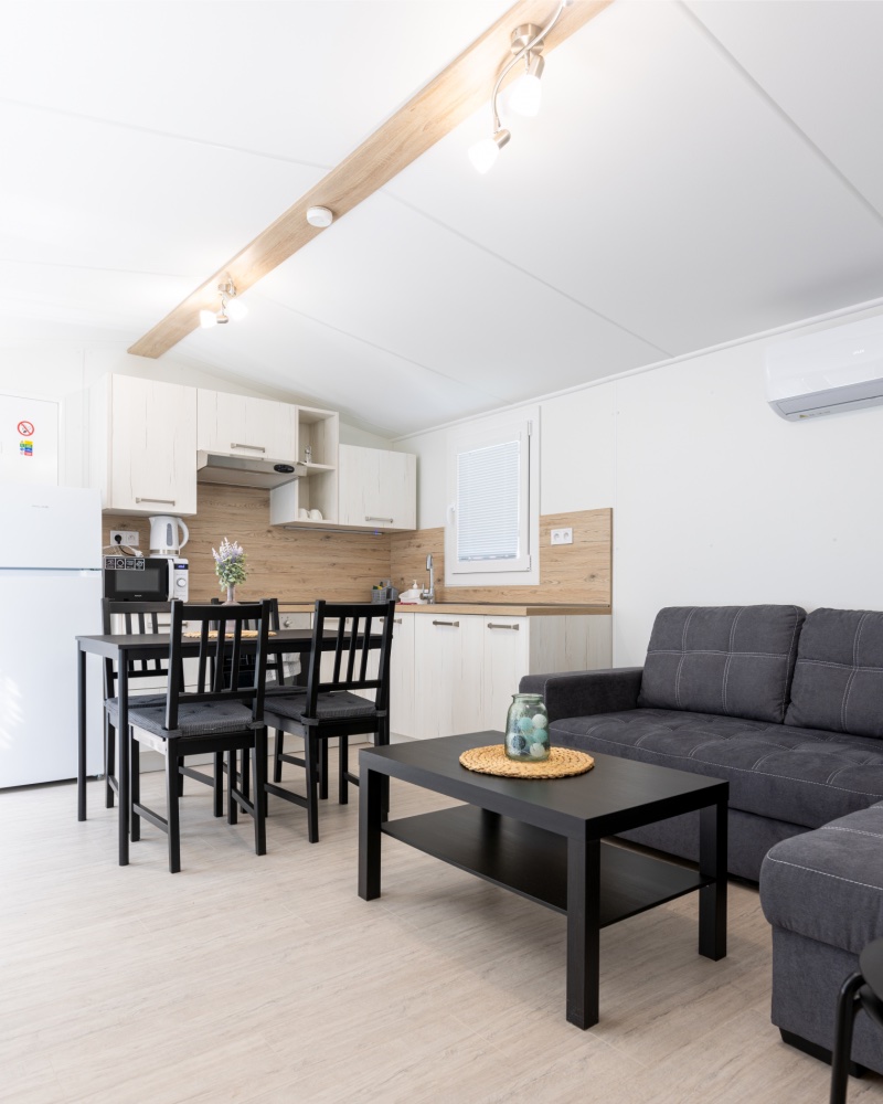 Obývací pokoj s kuchyňským koutem v mobilním domě Super Arktik