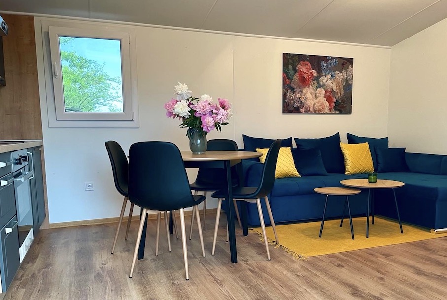 Jídelní kout v mobilním domě Super Arktik s moderní sedačkou