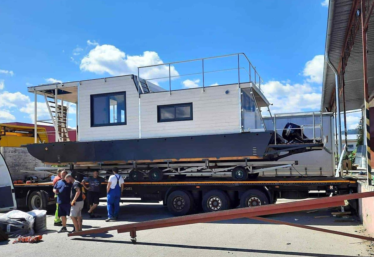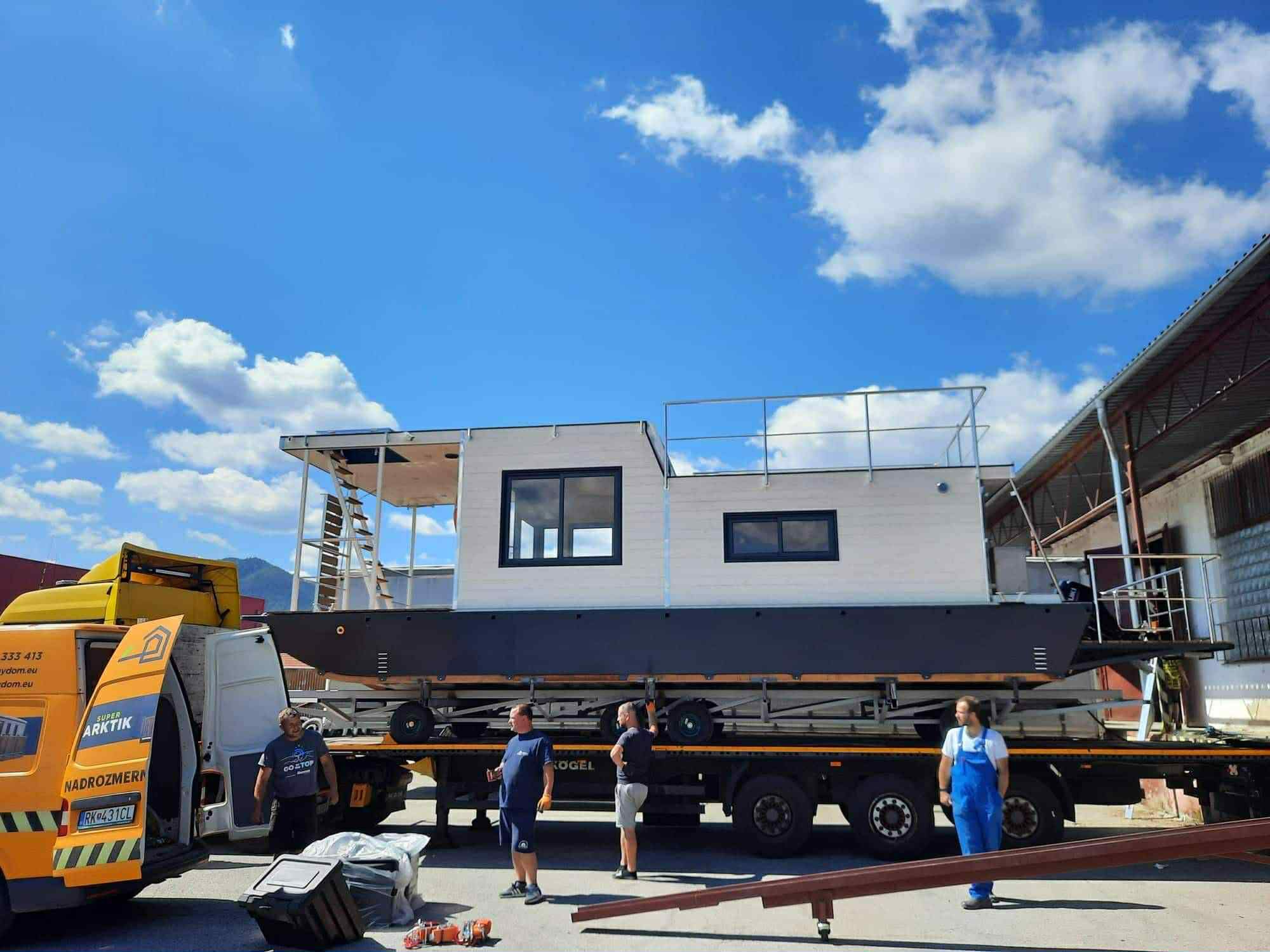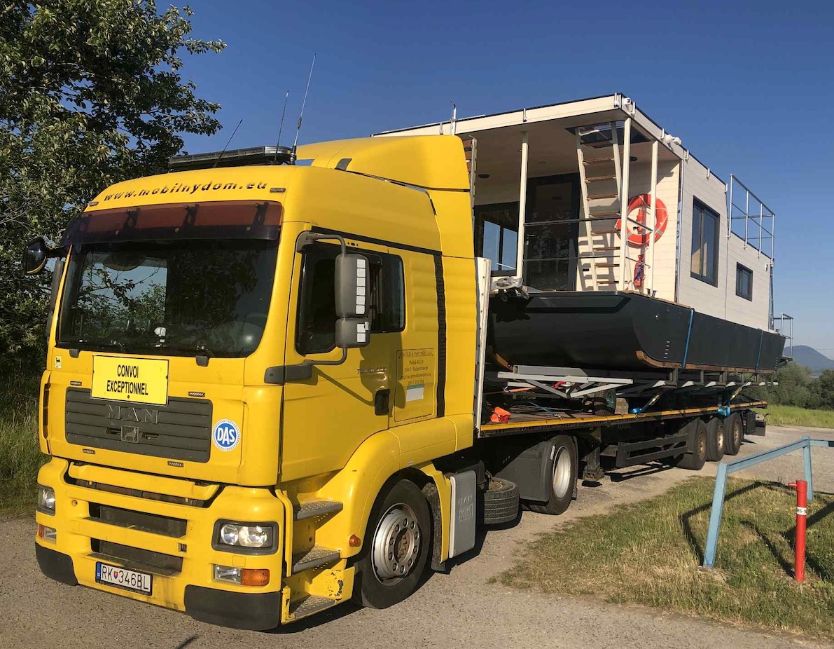 Plovoucí mobilní dům Super Arktik Houseboat při převozu
