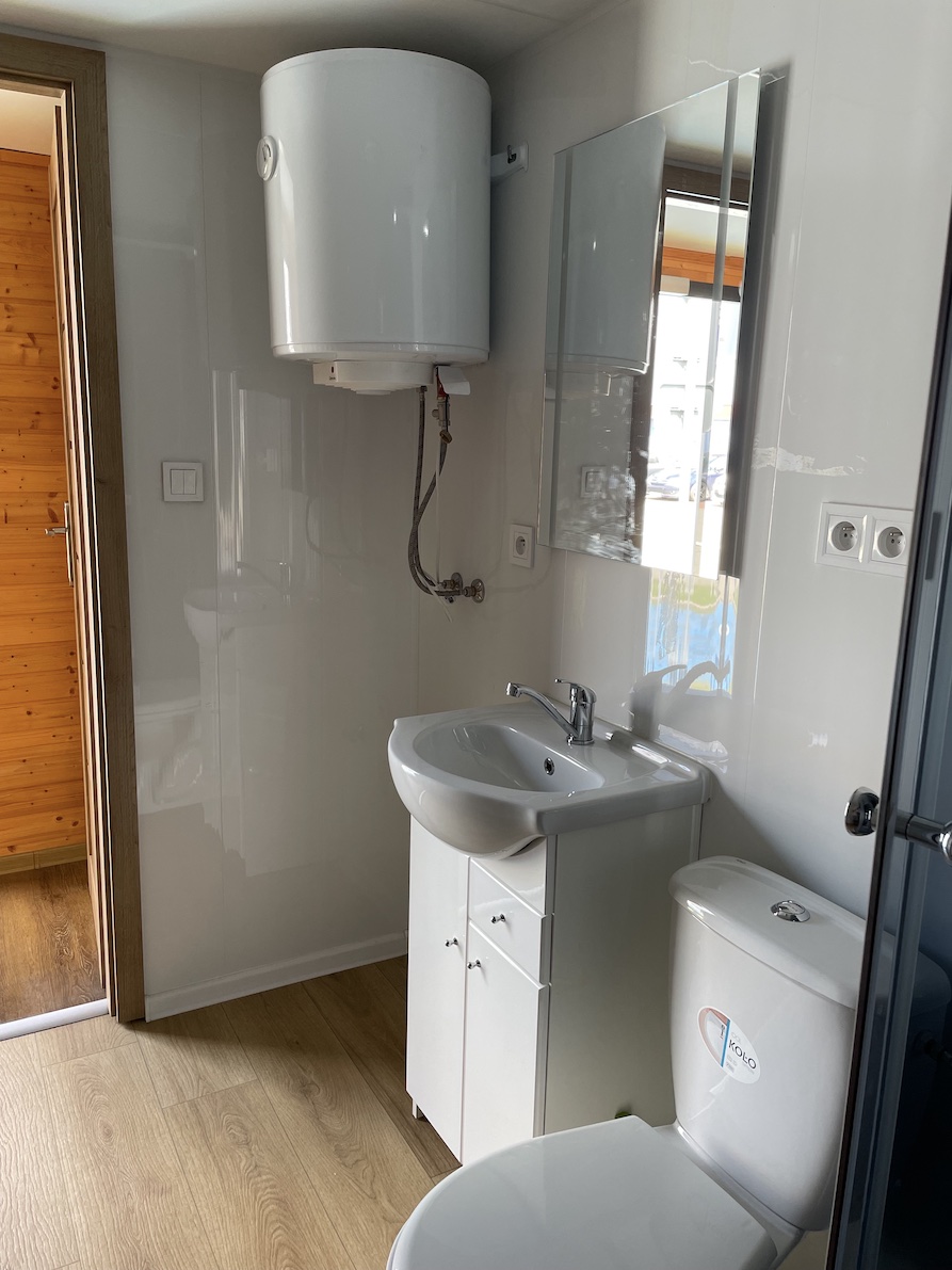 • Koupelna, komplet zařízená: sprchový box, umyvadlo, toaleta, vodovodní baterie, bojler 50l, předpříprava na pračku.