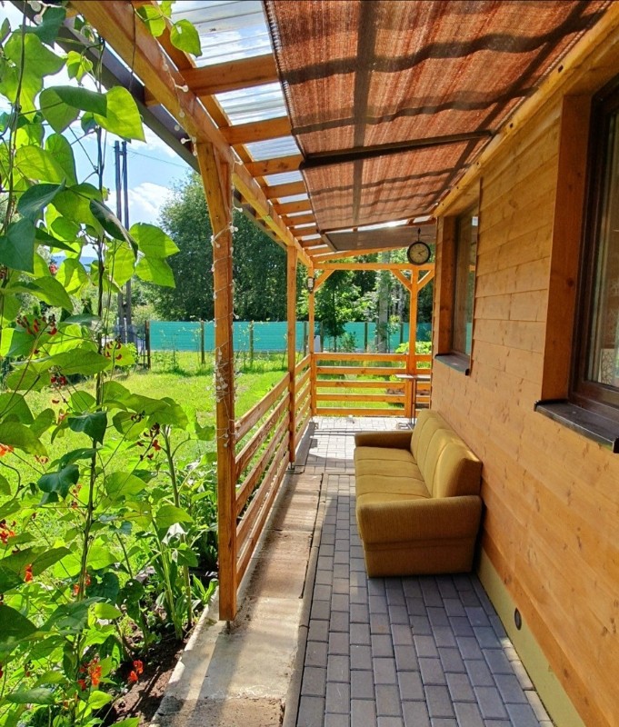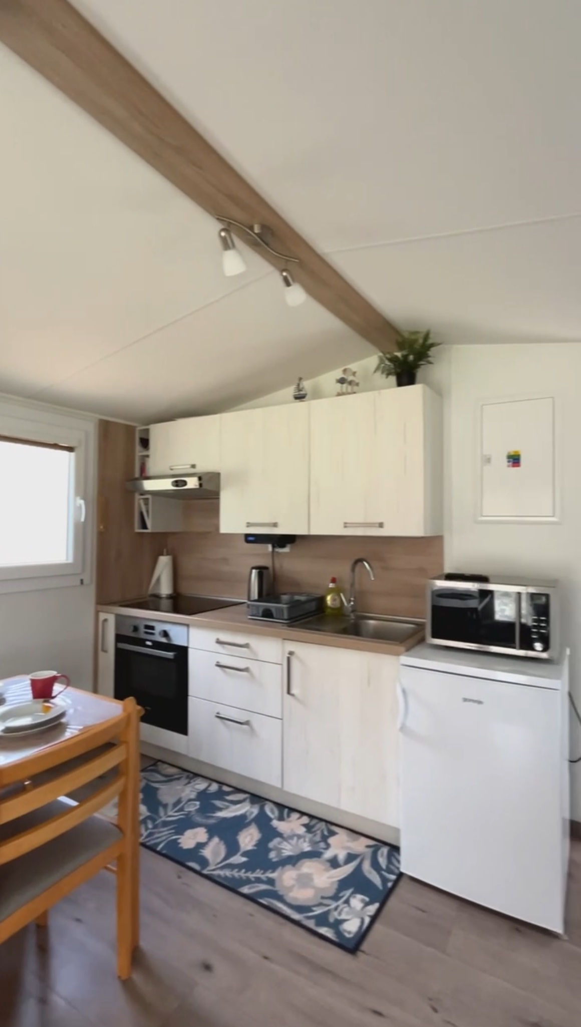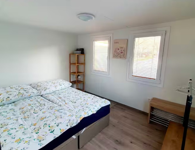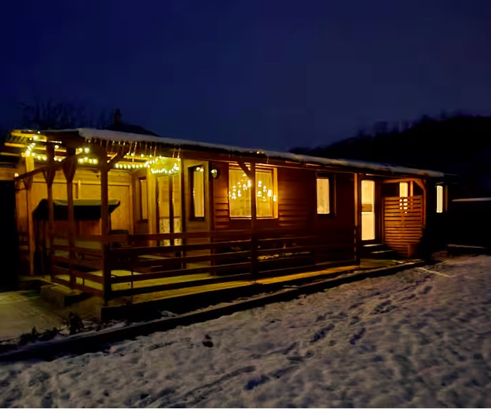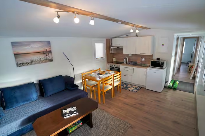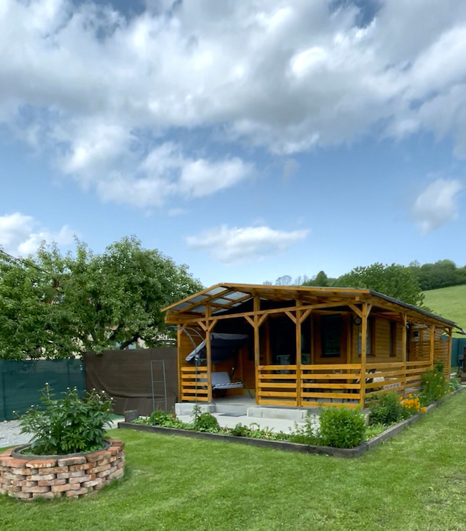 Mobilní dům WOOD se dvěma ložnicemi, pěknou terasou a velkou zahradou.