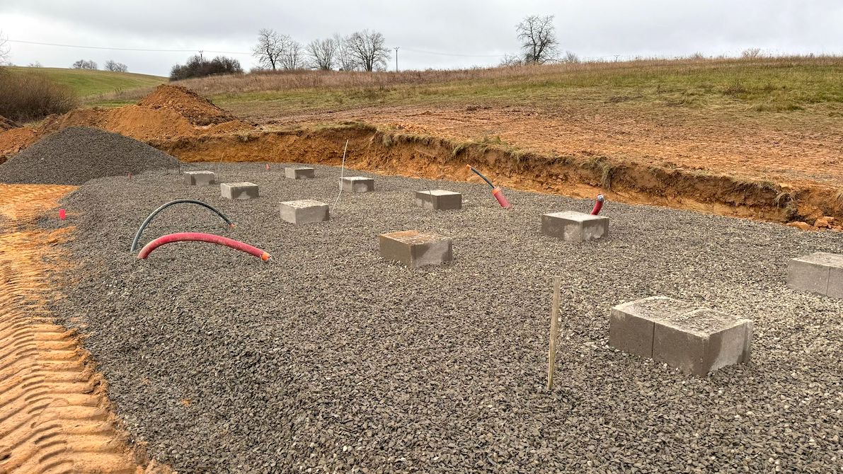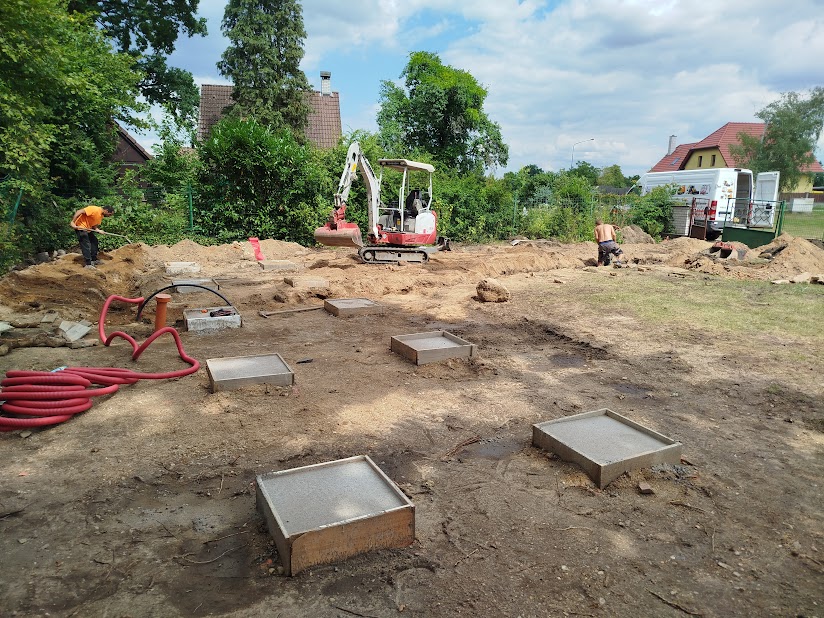 Zpevnění pozemku je klíčovým krokem při přípravě podloží pro umístění mobilního domu. Mobilní dům se osazuje na speciálně zpevněné body na konstrukci podvozku, které jsou následně umístěny na betonové kostky. Abychom zajistili trvalou stabilitu mobilního domu, doporučujeme pod betonové kostky vytvořit zemní patky do nezamrzající hloubky 80 až 100 cm.