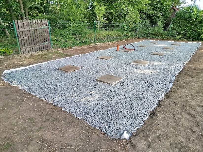 Pro zpevnění pozemku je také vhodné použít netkanou textilii, na kterou nasypete makadam nebo štěrk, a následně podloží udusávat vibračním plochým kompaktorem. Tento postup nejen zpevní pozemek, ale také zabrání růstu trávy pod mobilním domem a zajistí estetický vzhled pozemku.