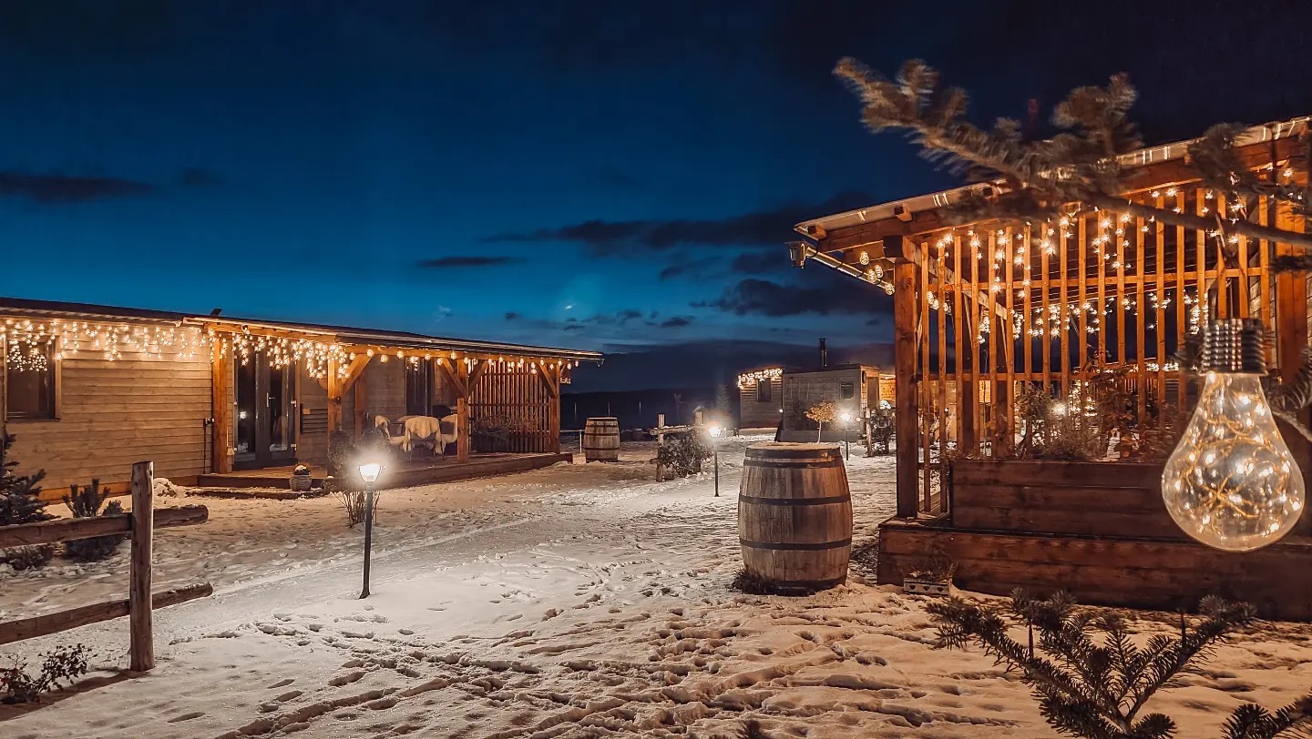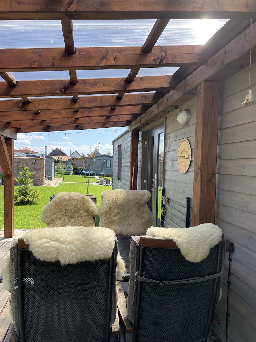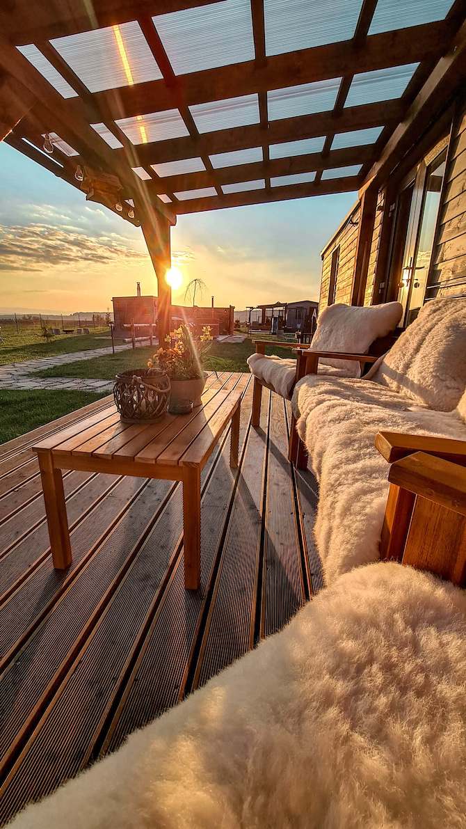 Čtyři mobilní domy WOOD se dvěma ložnicemi, velkou terasou, venkovním wellnessem.