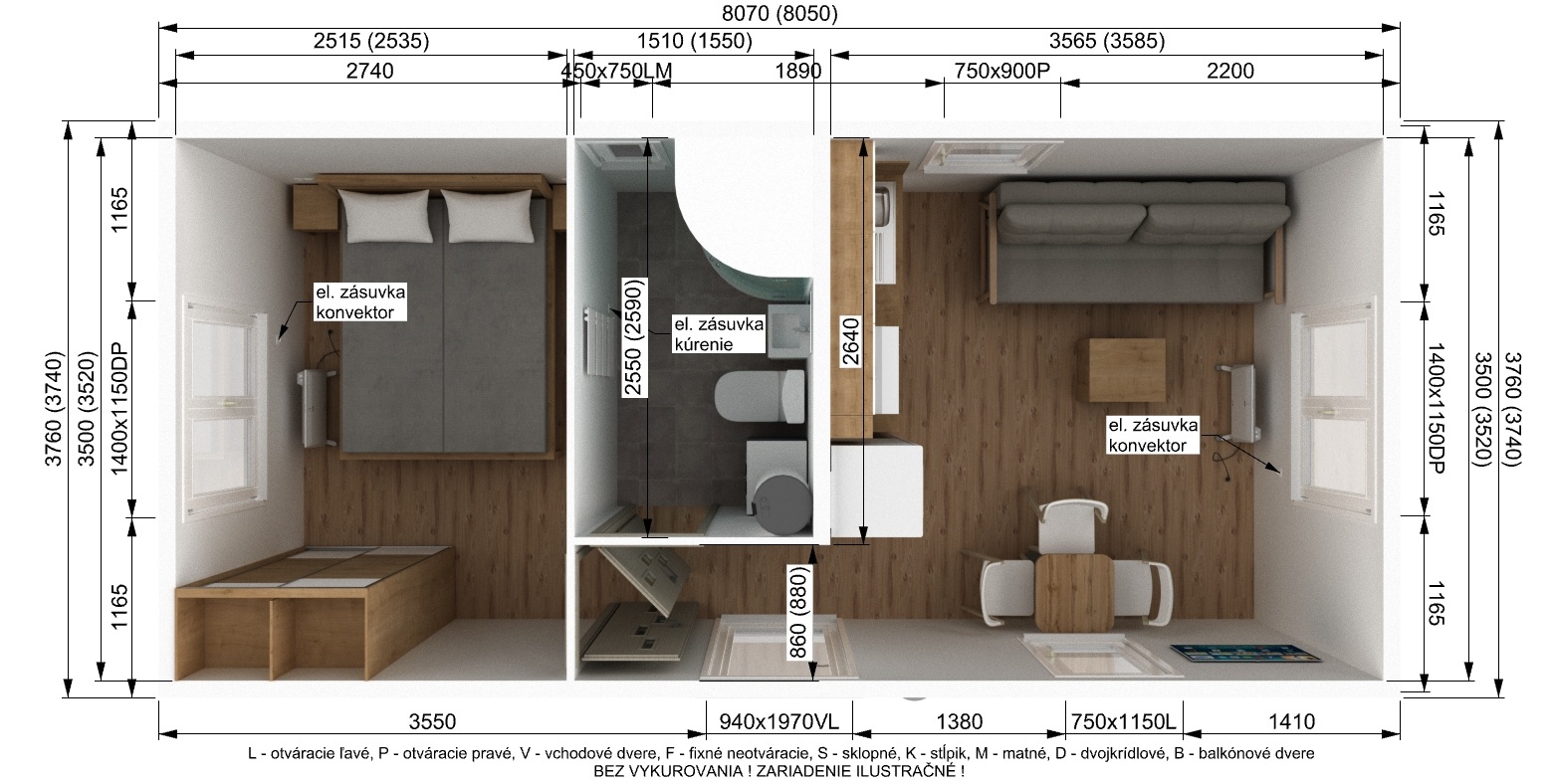 Rozměry (D × Š × V): 8 × 3,8 × 3,2 m