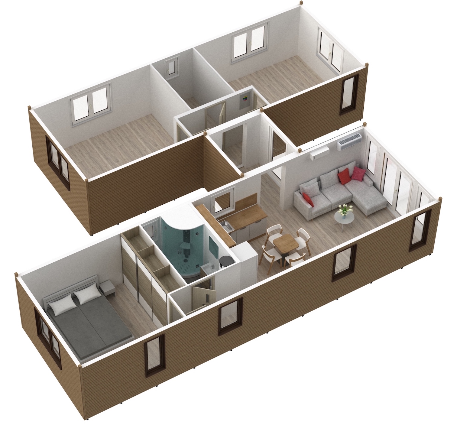Nabízíme k prodeji celoroční mobilní domy Super Arktik®, které po spojení vytvářejí prostorné a komfortní bydlení o rozloze až 88 m². Ideální řešení pro ty, kteří hledají moderní a plně vybavený domov. Dva mobilní domy jsou propojeny funkční spojovací chodbou, čímž vzniká plnohodnotný obytný prostor s velkými místnostmi. Domy jsou vhodné pro celoroční využití v jakýchkoli podmínkách.
