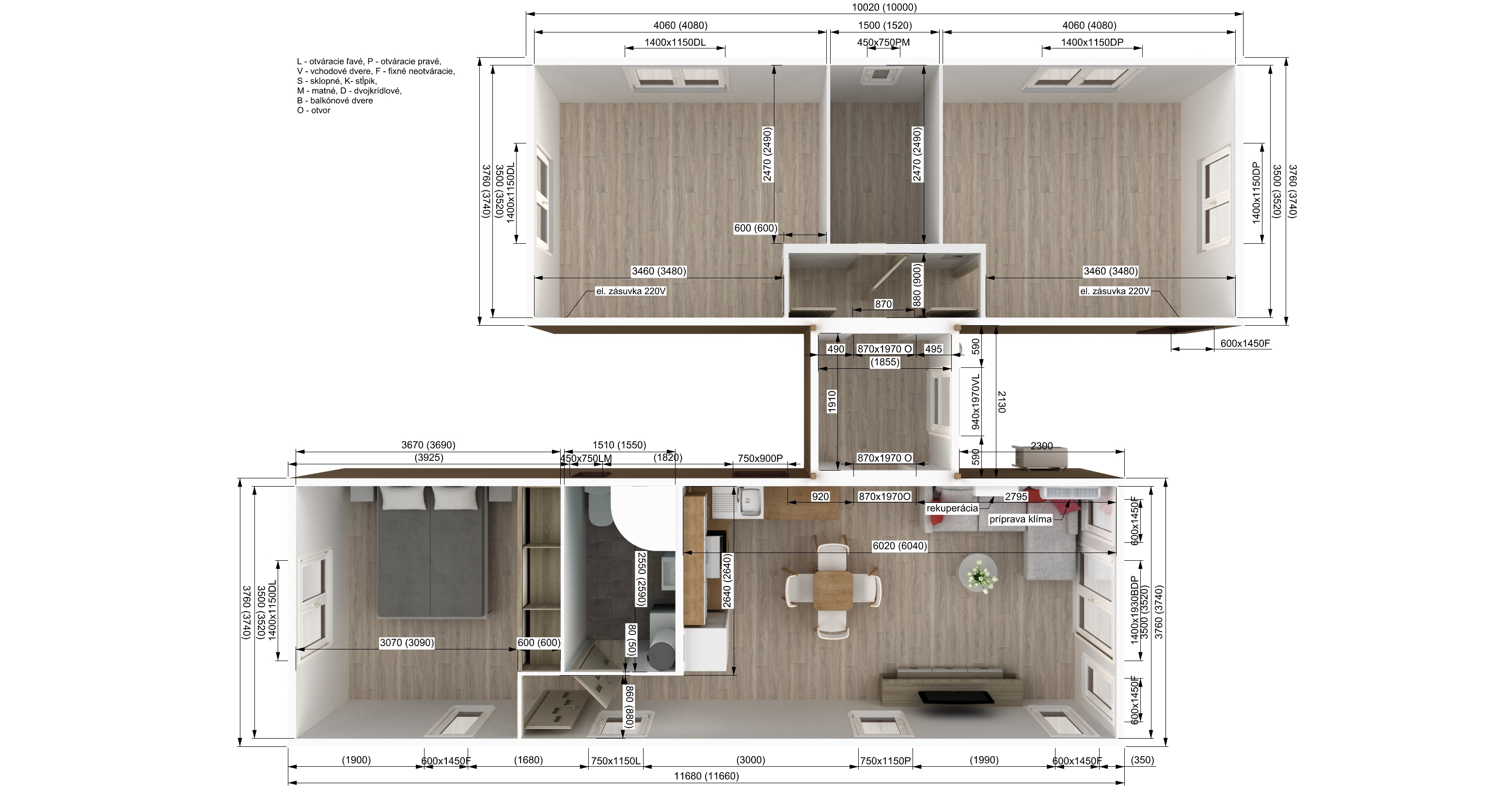 Dispozice a rozměry – Dva propojené mobilní domy
