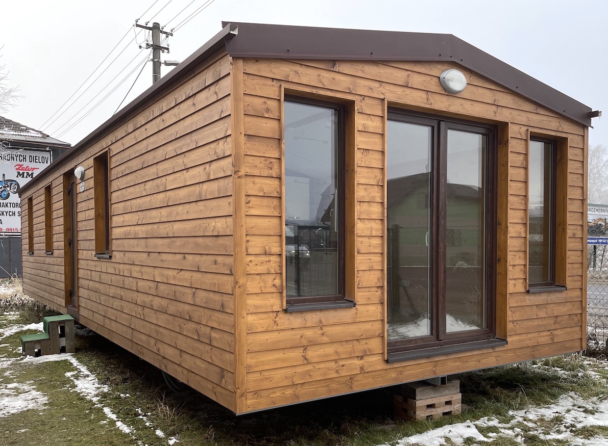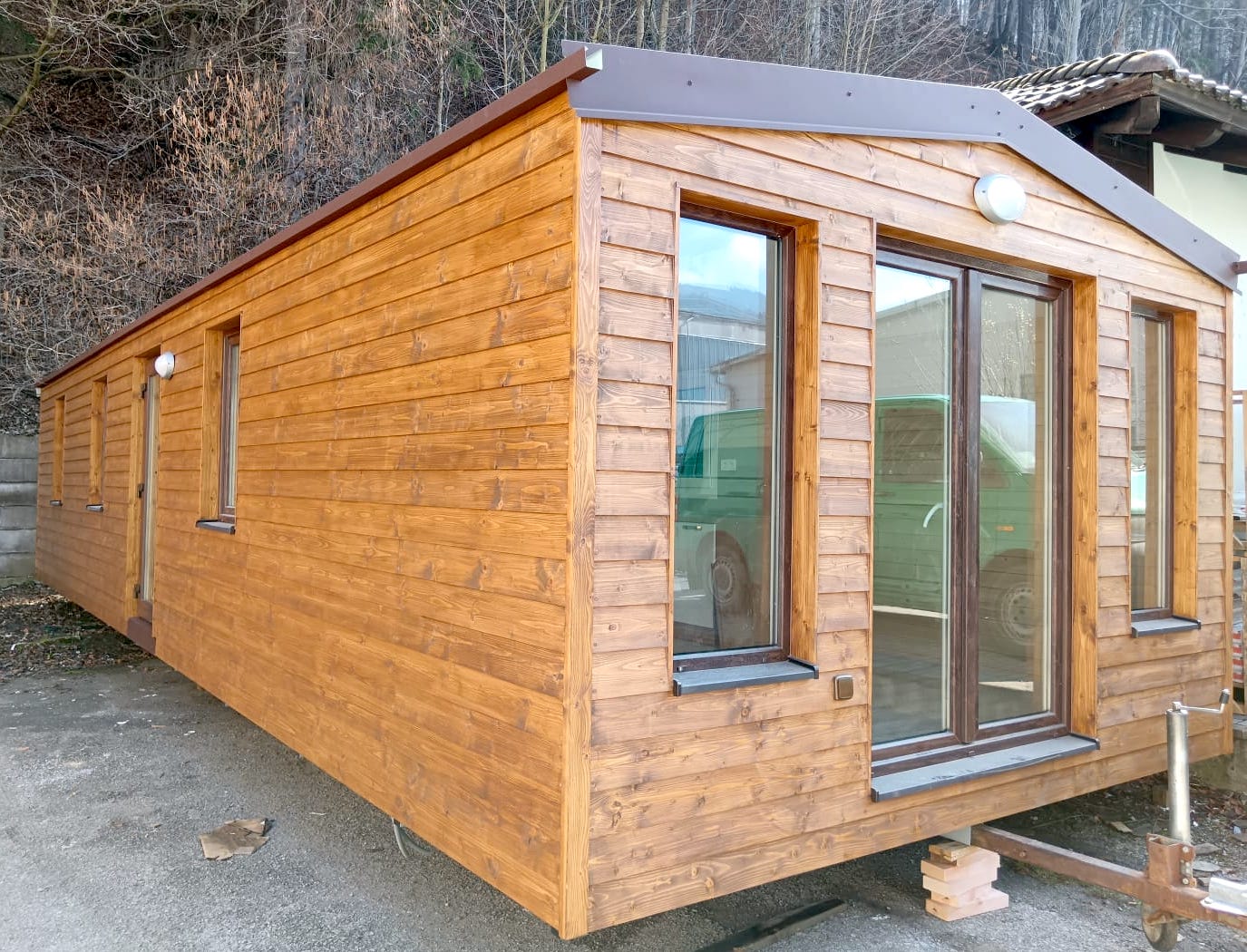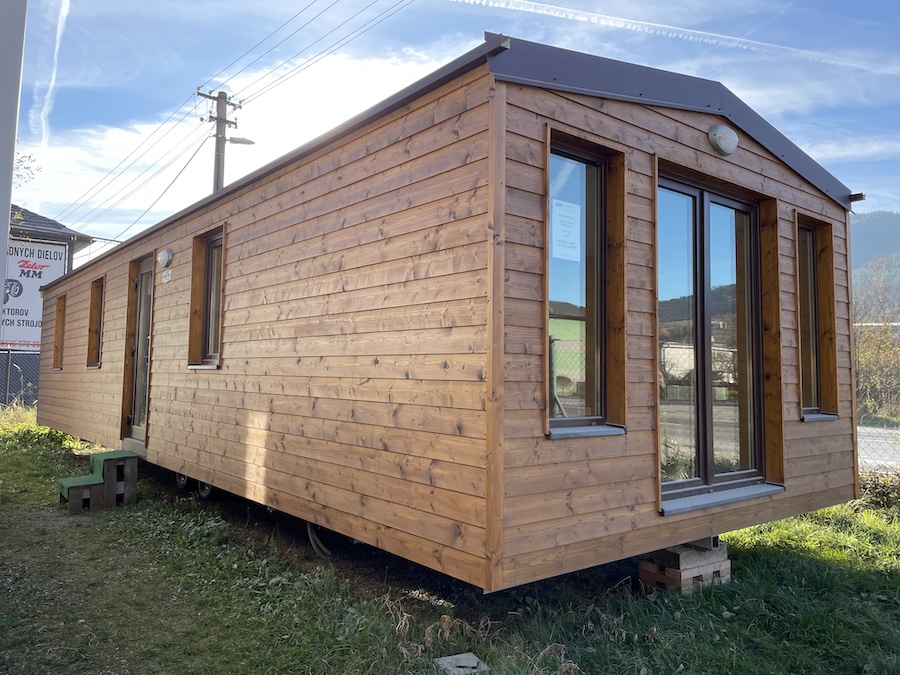Nový celoroční mobilní dům s vnějším dřevěným obkladem. VIDEO z mobilheimu naleznete zde