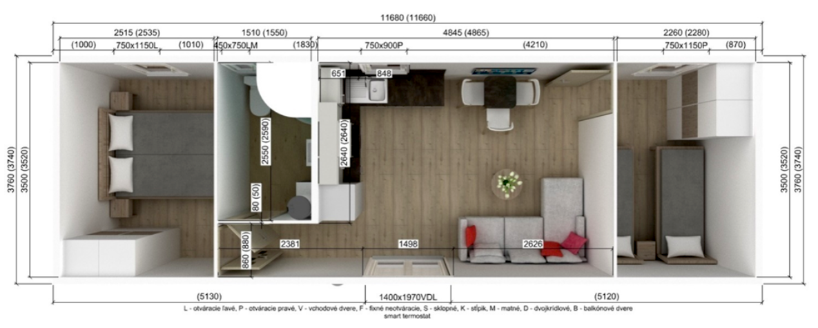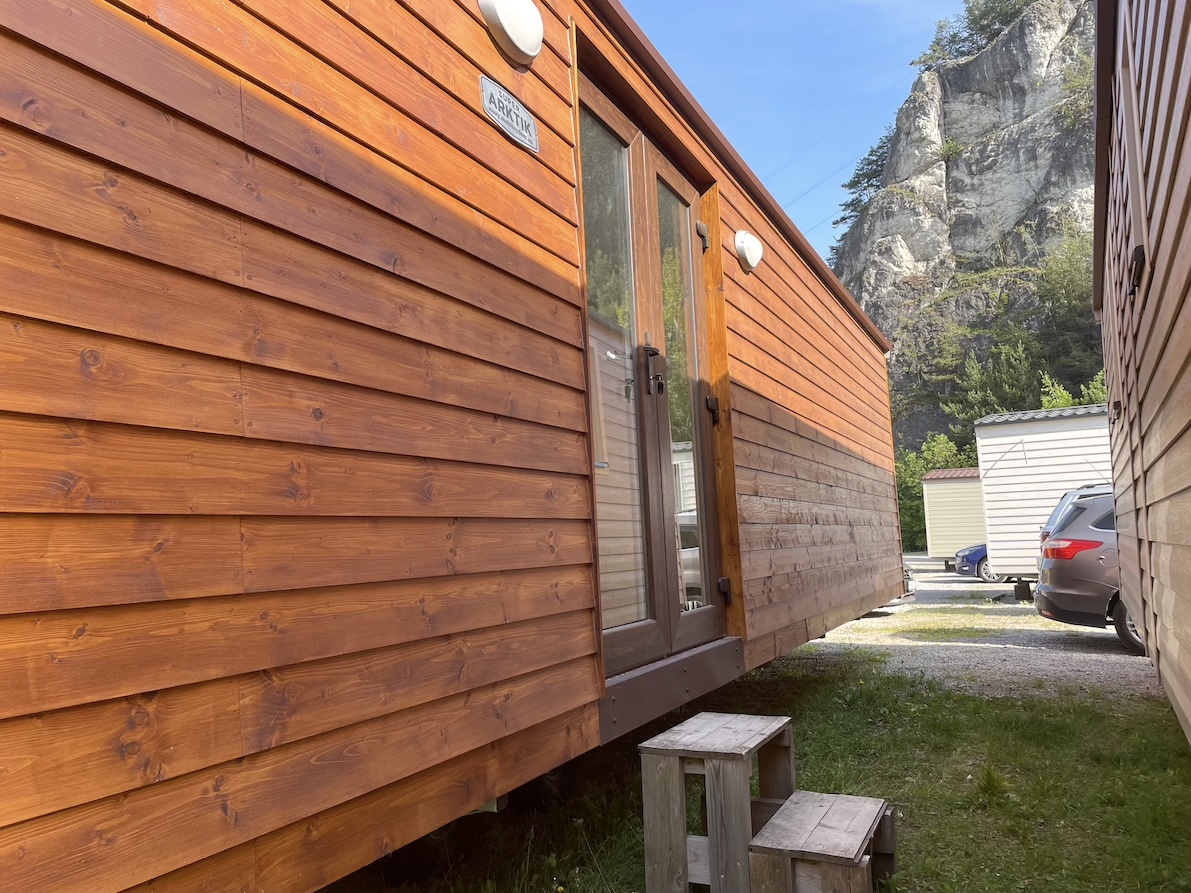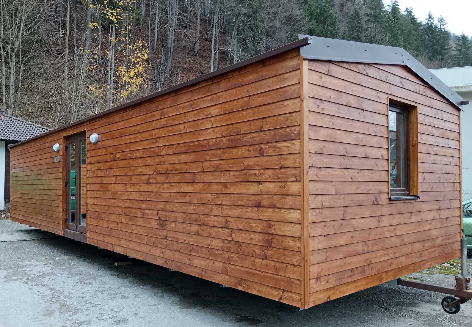 Nový celoroční mobilní dům s vnějším dřevěným obkladem. Rozměr (D x Š x V) 11,7 x 3,8 x 3,2m. Dispozice: obývací pokoj spojený s kuchyní, dvě samostatné oddělené ložnice, koupelna s toaletou, chodba.