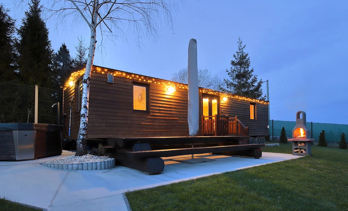• Mobilní dům s dřevěným obkladem a elegantním vzhledem